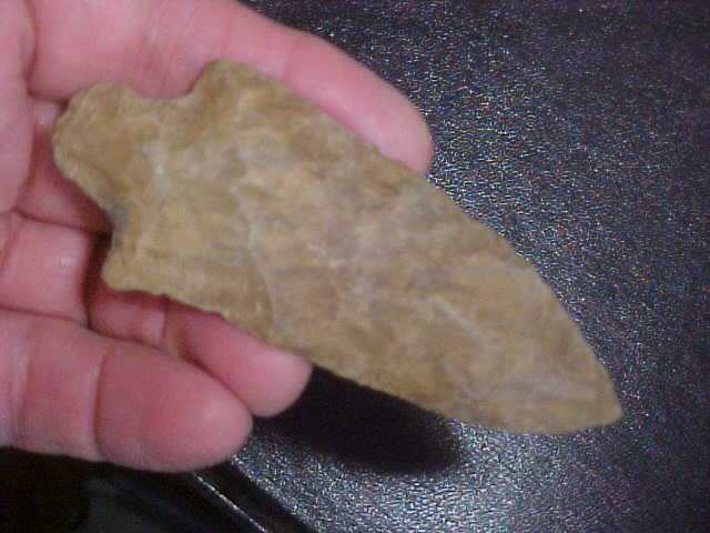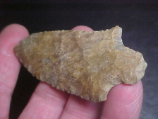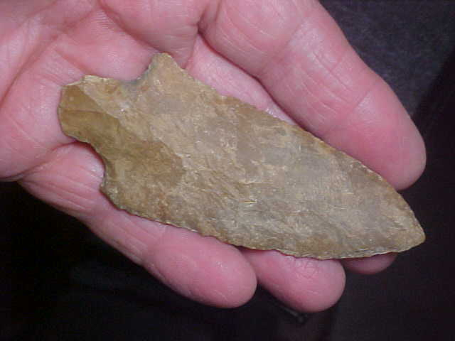 The rounded basal form, when you have the kick-out barbs, I use the Pickwick classification--Mulberry Creeks, about the same Late Archaic timeperiod, you get some crossover in form, same with some very large Adena points (knives). This 3&11/16" by 1&1/2", 3/8" thick hafted knife is made of a creek patinated Dover Flint--a good quality of that Western Kentucky Dover, too, good gloss. Check out the pic of the stem, that's creek patina worked into the flint, 'proper aging' some would say. While you can see some ancient usage on the blade (and stem) there isn't any true damage--minor use-made nicks don't count IMHO. One blade edge shows more sharpening action than the opposite, you can spot the more in-curvate edge where all the sharpening, the use, took place. Nice knife, guaranteed authentic in every detail. Shipping is $8.00, payment can be by check or money order, but please note that I do not use paypal-type services--Roy A.