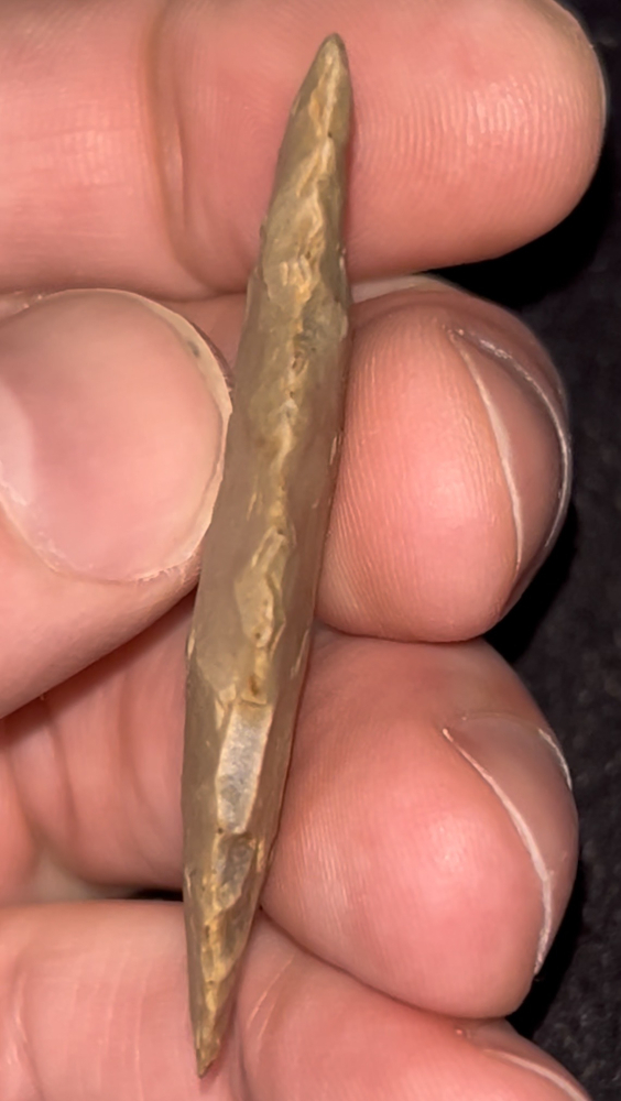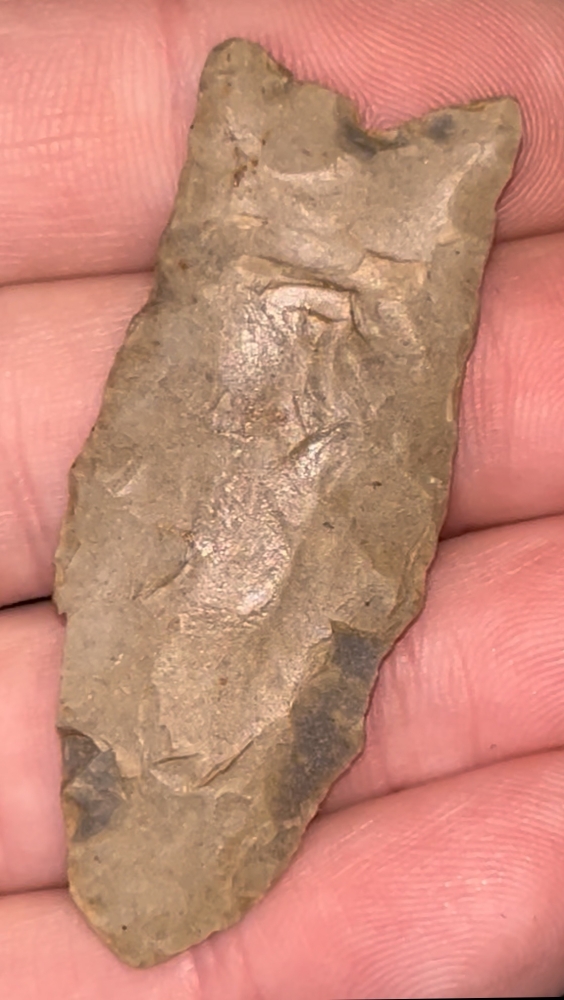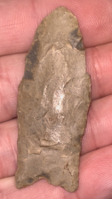 A very nice Clovis found in Kentucky. Made from grey Fort Payne chert that is heavily patinated to a medium brown, as evidenced by some small nicks around the edges, with excellent mineralization. Thin and well made with nice narrow style and light fluting on both sides.