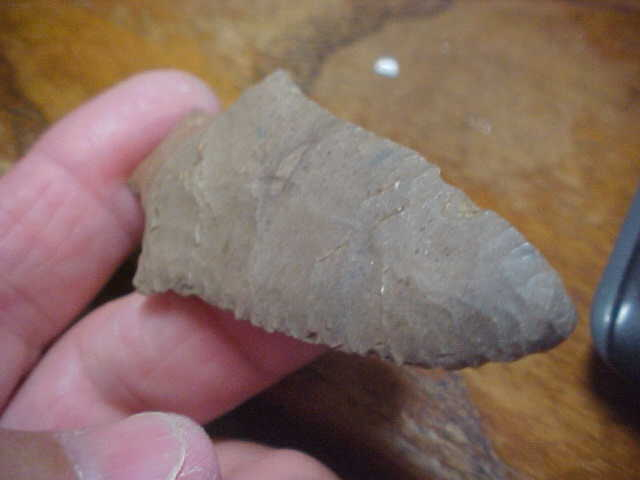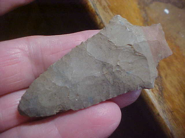 One look at the grade of hornstone, you know the piece came from either far southern Kentucky or west-central Tennessee--certain flints, they're only found in a particular part of the country, this 2&11/16" Pickwick (to me) says western TN. The point shows a great deal of use, the tip having been used as a buffing application, slight wear on the one barb resulting from use & resharpening of the more heavily used work edge--many knives, one side took all the wear. The stem shows the heavy degree of iron in the area where the flint formed--nice piece, REAL. Shipping is $8 (blame the post office, small packages are no longer cheap to send. I take payments only by check or M.O., I do not use paypal-type services--Roy A.