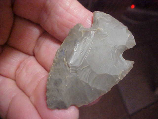 Found along the Ohio River in the S.W. corner of Indiana, Vanderburgh or Posey County, this Hornstone Hopewell measures exactly 2" by slightly over 1&1/4"--VERY symmetrical in form and thickness (3/8"). The point has been in my collection for a while simply because of that fine symmetry. You can see the one small nick up near the tip, not sure if it was a bit of flint that broke off with freeze-thaw as it's be an odd spot for 'use-damage' to a knife, being so rounded. Both barbs are intact, the one just looks like the Woodland Culture knapper was fighting with 'stacks' in the flint...places where the flint had a 'grain' to it. What I'm trying to describe is flint that cooperated (with the knapper) in most areas, but presented challenges in others. The Hopewell artisan who made the point, he did a pretty decent job of it. One note--I've never washed the surface sandy soil off the point, put it under a 10x loop, you'll see that. Shipping is $8.00 and payment can be by check or M.O. as I do not use paypal-type services--Roy A.