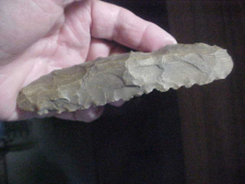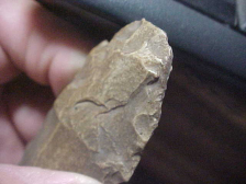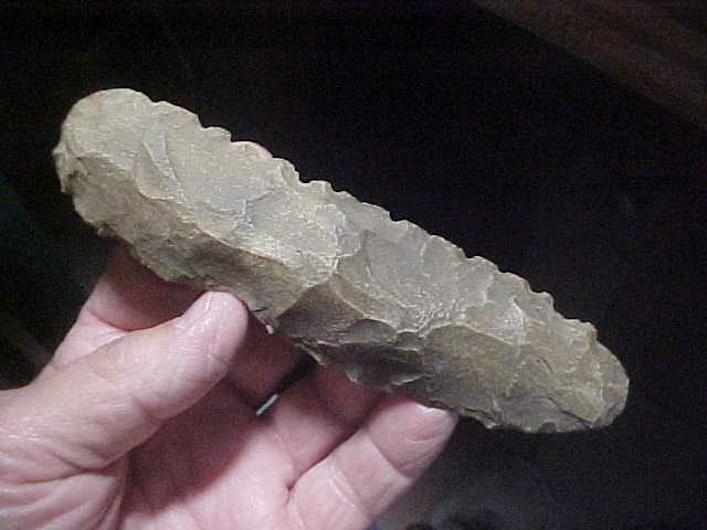 One big, big piece of flint, so much patina I'm going to stick with "tan chert" as the flint identification; length is close to 5&9/16" by 1&7/16", the thick medial ridge reaching 11/16" max thickness. The piece is out of a S.W. Indiana collection, could be an Indiana find or a Kentucky creek find, it wasn't marked to tell us--authenticity is no brainer, whichever creek produced the find. Features: the chisel end shows strong use polish to the thinner end, flint took on a polish (see the close up, you can see the gloss from use as a chisel) Next is the serrated edge. That sort of serration is very unusual on a hand held tool, big "key hole' type notches. Too, there is an indented shaft scraper (or bone scraper) on the top edge--really a multi-purpose tool. One specific feature I've been experimenting to understand--HOW did they hold the piece--obviously you don't want to be gripping the serrated edge, so how'd the piece fit their hand? And which hand, generally you could tell if the user was right (or correct) handed. I haven't worked that one out--experiment, you may be the one to figure how the tool was used. One small note--on the chisel end, away from the serration, there is a deliberately ground-smooth finger tip hold--I think it's a reasonable guess that that one spot tells us at least one of the ways the serration was used. One fascination artifact, I think, real in every detail. Shipping is $9.00 due to the weight, checks or money orders are the only way to pay for the piece. Sorry, I do not ues paypal-type services--Roy A.