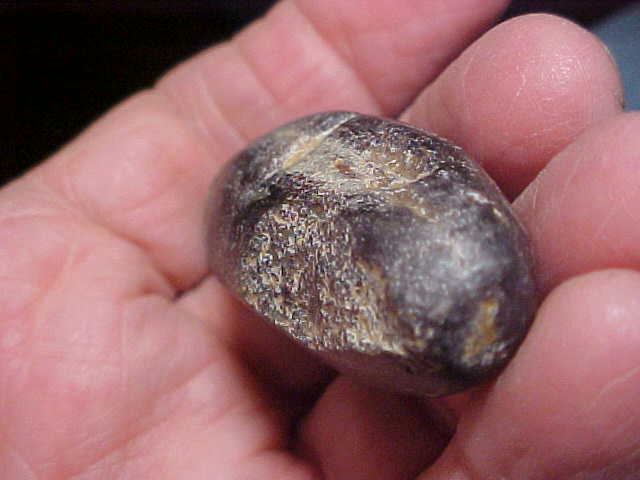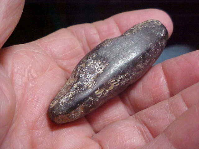 Some ancient user-Late Archaic Period is my assumption based on the cultures that made Plummets, spent a lot of time grinding, polishing this stone ( a low grade Hematite, I'd describe it, based on the density/ weight). Length is slightly under 2&1/2" by 15/16" 'high' at the center, thickness of 13/16". The finder was living in my area, but hunted three states--here in Indiana, along the Ohio River in both Kentucky, and down into deep southern Illinois--he left no provenance to say where he found the piece, but a lot of his material I learned was from western Henderson County, Kentucky--that county is my "best guess"--Alzey, Kentucky, area--RICH in artifacts, there near the Wabash River/ Ohio River confluence--and about every ancient culture represented (I've hunted there many, many times), but have never had the luck to find a grooved piece like this one--do you call it a boat stone, a plummet, a fishing weight, or, well, you pick a name. Personally I do not think you put this much time into a simple net weight, so 'decoration', "Loaf Stone", some jewelry item you would wear seems the most likely answer. You decide the perfect name s it goes in your collection--what I'll do is guarantee the piece is real in every detail. Shipping is $8.00, checks or M.O>s are how I welcome payments. Sorry, I do not use paypal-type services--Roy A.
