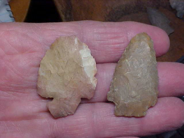 Shipping is included with the group of Early archaic Culture points from S.W. Indiana. These are as-found, so any damage was use-made. The longest is 2&3/16", a fossil chert either Heavy Duty or Hardin (I go back-and-forth with classification each time I look at it)--stem grinding is there, but it seems wide for a Heavy Duty. The Holland, Indiana, chert Pinetree lacks a tip but still measures 1&7/8". The red/ greenish-tan Thebes is 1&5/8"--shame about the tip and base, but it's "as found"--THIN, only 3/16".The Kirk Stemmed-Serrated is 1&3/4", the hornstone Palmer is 1&11/16", and the fossil chert Big Sandy is 1&1/2"--shows considerable ancient use with that polish. ALL are guaranteed real. I welcome checks, cash, or M.O>s, but do not use paypal-type services--Roy A.