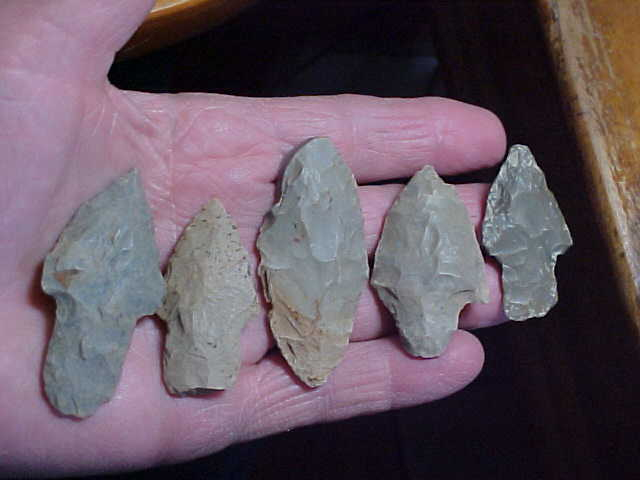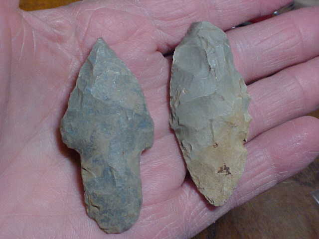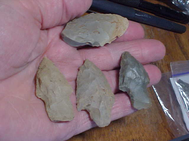 Some S.W. Indiana Adena points--all made of Hoosier Harrison County Hornstone. The "Beavertail being the best of the group, 2&5/16". The middle point is slightly longer, but shows the darker scar of an impact fracture--not too recent s the flint has started to repatinate. On the right end is a square stemmed Adena--not sure if that one was a creek find or if the finder simply didn't wash the point,1&3/4"+. Of the smaller two Adenas the one has a flat base, the result of the knapper running short of flint as he was forming the stem, and the final point is a rounded-base Adena (1&11/16"). These came from a Vanderburgh County, Indiana, collection, they're real in every detail. Shipping is $9.00 (due to postal rates), and checks, cash, or M.O.s are the ways I welcome-in payments. Sorry, I do not use paypal-type payment services--Roy A.