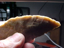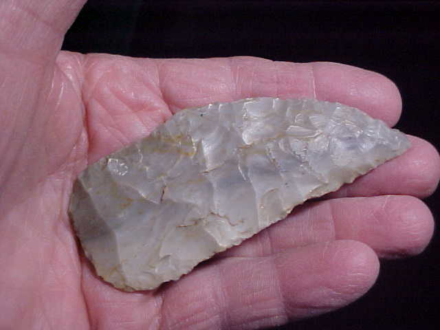 The flint is our Hoosier Spencer County, Indiana, creek-found Holland Chalcedony--the knife also found there in Spencer County. Length is 3&11/16" by 1&1/2", 7/16" thickness on the medial ridge. culturally, the curved knife is Early Archaic in time, 7500BP--pressure chipped, patinated, worn with long usage. As the 'crescent' shape is slightly unusual, I expect the piece started as a rounded-base Cobbs Knife, but the sharpening, done on one face for the most part, slowly rounded that main cutting edge--see the backlighted photo, you can spot the yellowish patina from the long use. Good piece of flint, I think, REAL in every detail. Shipping is $8.00 with checks or M.O.s the ways I welcome payments. Sorry, I do not use paypal-type services--Roy A.