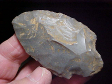 Most generally I'll start an item description with the where-found, but when there is an unusual feature, maybe that's the place to start--THICKNESS is 9/16" (that's not a typo)--I've had this Adena in my hands quite a number of times now, and still can't provide a good answer why it was made so thick--almost like the knapper took a cache blade and forced a stem. The fact that the point/ knife was lost there on the Perry County (or Spencer Co.), Indiana, camp debris, washed-out by spring floods, well it may have proven to be a one-time-use, the knife abandoned because they couldn't thin the blade without considerable narrowing--the only way to thin a blade, flint knappers tell me. Not being a knapper, I rely on the info I get from people who specialize in studying the techniques of ancient peoples. At least two of the major authenticators in the country are also students of knapping--knowledge they put to use when authenticating. Okay--length is almost 2&15/16" by a wide 1&11/16"--interesting Adena, 100% real. Shipping is $8.00, checks, cash, or M.O.s. Sorry, I do not use paypal-type services--Roy A.