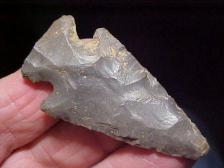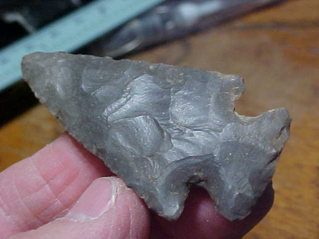 Price includes the shipping cost on this hornstone Kirk Cornernotch out of Posey County, Indiana--2&3/8" by 1&1/4"--thin blade, barely reaches 5/16". Being a Kirk Culture point there is no detectible basal edge grinding--and naturally no bevel sharpening to the blade edges. The piece was stored-away for some four decades, never washed to get off the field dirt. Some of the soil shows in the use-worn tip--barbs and basal corners are in great shape, though, with every patinated detail authentic. I welcome checks or M.O>s, but do not use paypal-type services--Roy A.