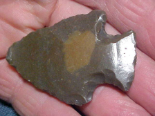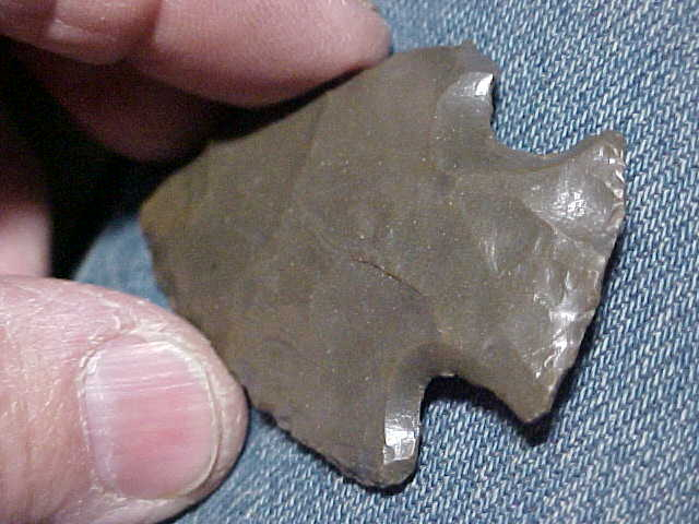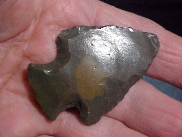 The polish is ancient--Hopewell work, not modern--I tried every chemical from Acetone, alcohol, brush cleaner (toluene) I could think of--I've done a lot of painting, have a good idea what cuts through anything applied to the surface of flint. This polish is from ancient rubbing, it's not an 'add on'. best guess I've come up with is that the Hornstone Snyders, Massac County, Illinois, was rubbed against leather, over-and-over...likely on a snowy day like today, someone stuck in a hut, waiting for the weather to improve. Length is 2&1/4" by nearly 1&5/16"--slightly over 5/16" max thickness. The finder gave me the provenance, so I know it's an Ohio River beach find--real in every detail. The barbs and the tip show minor wear, but it's the polish that makes the piece collectible, I think. Shipping is $8.00 with checks or M.O>s welcomed. Sorry, I do not use paypal-type services--Roy A.