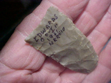 A Clovis I 'put back' a few years back, ex Norman Reid Indian Hill Museum (private museum) in Bone Gap, Illinois. Norman marked the point as having been found in his home area, Edwards County, Illinois, in 1961--he signed most of the pieces in his collection, at least the ones I added to my collection--good provenance. This really, really thin Paleo measures 2&1/8" by 15/16", the blade barely reaching over 3/16" thickness in the very center, then thinning to both base and tip. One lateral edge shows good grinding, the other edge you detect grinding only on the bottom 3/16" (a small chip in the side, so small it may not show up in the photos. The basal edge, while it does show 'flute-like flakes' has very little basal grinding--grinding isn't absent, it's just barely dulled. The toning of the flint is consistent with Illinois Hornstone--Cobden Flint. Note the tip, it has almost a 'beveling technique' to get a sharp point--that method having been done as the piece is so thin there. Every detail, patina and form is consistent with the Late Paleo Unfluted Clovis--i.e. it's real. Shipping comes with the price, checks or M.O.s are how I welcome payment. Sorry, I do not use paypal-type services--Roy A.