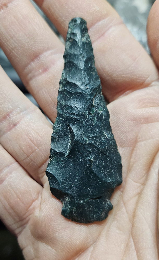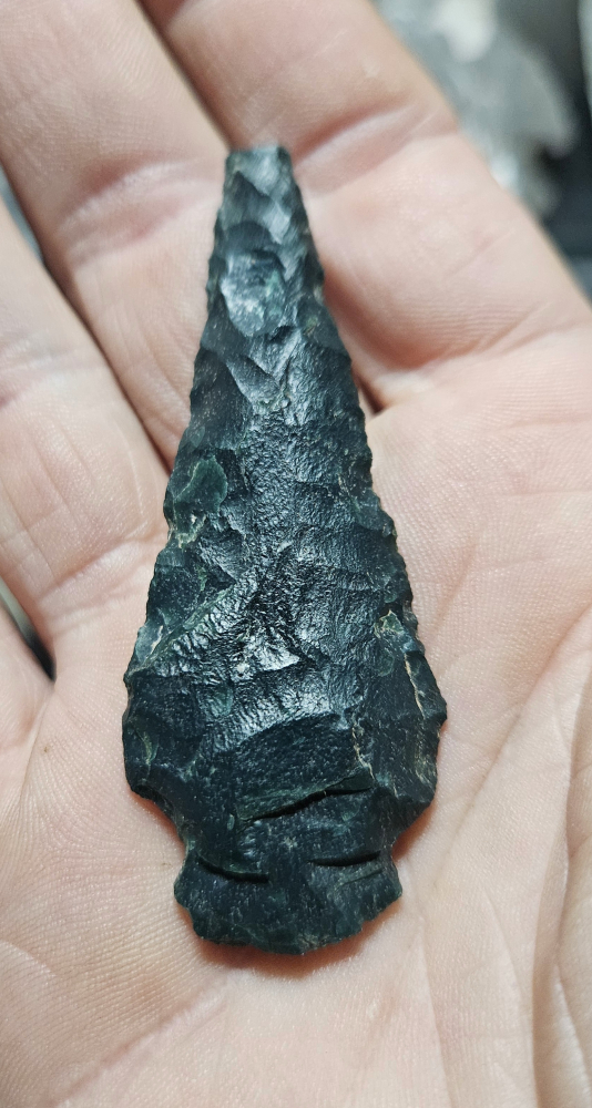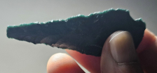 Exceedingly rare neolithic Stemmed point from India. Nice working on a stunning piece of deep green indian bloodstone. Lithics from India are very rare and this is a chance to get something extra special. Measures 2 1/2 inches long.