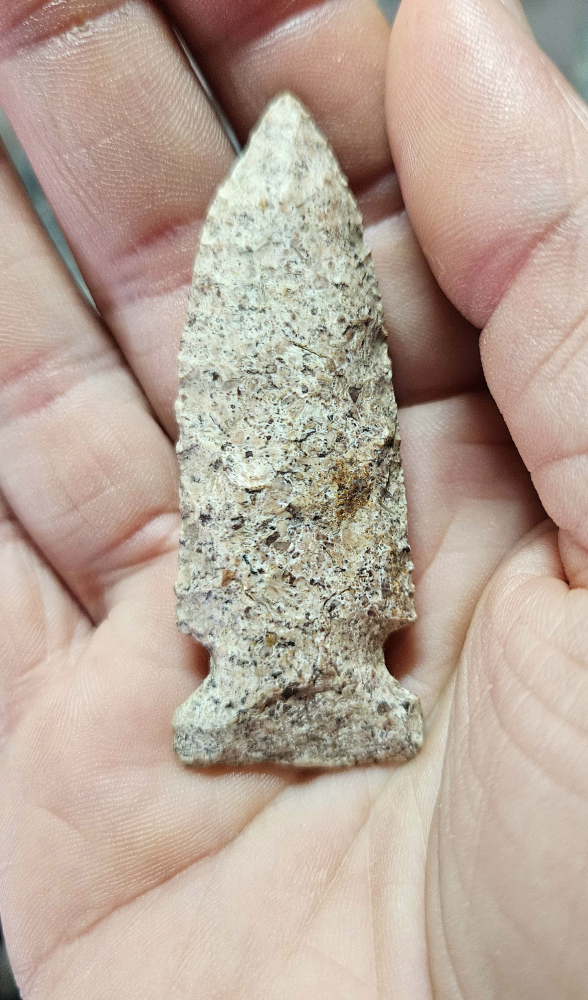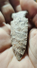 Very fine Big Sandy point from Clay Co, Illinois. Excellent workmanship with incredible attention to edge. The material is harrodsburg chert with lots of pinks and peach. Measures 2 1/4 inches long.