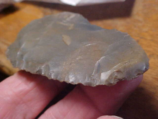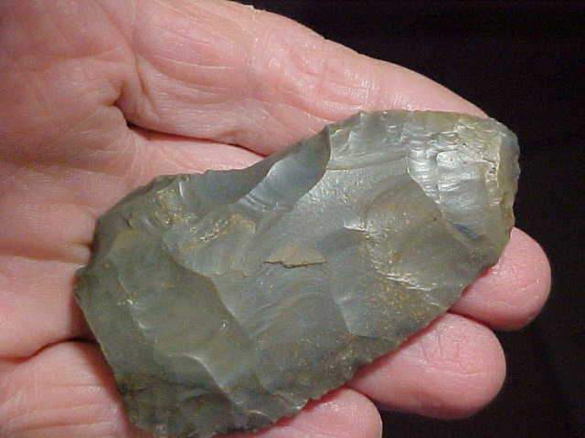 Some artifacts, they don't have to be a G-10, they just have to have "that feel" when you pick them up--guaranteed you'll find it when you hold this Vanderburgh County, Indiana, hornstone knife. Once upon a time there may have been some sort of stem--the flaking patterns tell me it's Early archaic Culture (7500BP), but was it a cornernotched type--that's my 'best guess'--you don't see blade edge beveling so you can rule out Lost Lakes, although the missing stem could have been an early stage Dovetail. Regardless of the culture that fashioned the piece, it just feels GOOD. Length is slightly over the three inch caliper line, width is 1&11/16"--the 3/8" thickness tells of a strong blade--so how'd they break it??? Ancient modifications of the tip area indicate it became a hand-held tool; also, the one side has what looks like (based on the patina change) later period damage. There is enough "re-patination" that I would think some later culture (Woodland) found and utilized the knife. Guaranteed real, period--it's been in my collection for some time, and welcome here for the next thirty years (if I'm still around). Shipping is $8.00, checks, cash, money orders welcomed. Sorry, I do not use paypal-type services--Roy A.
