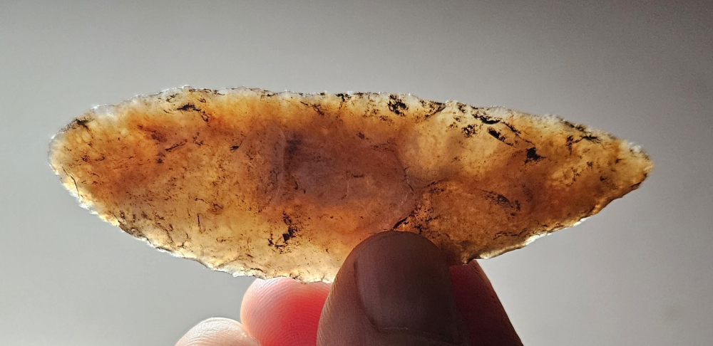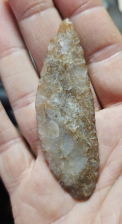 Excellent bifacial side knife from Wyoming. Very nicely made on a stunning translucent chalcedony. Measures 2 3/4 inches long. Fantastic piece for the plains collectors or anyone needing some color.
