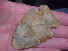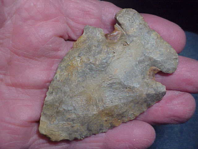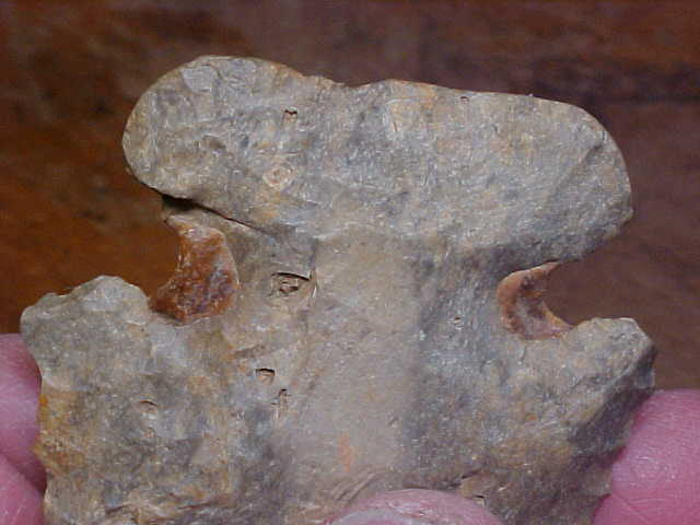 I was talking about "favorite Thebes' points with a friend, Mark W., mentioned this, my personal favorite, so--just for display--here is the creek find--S.W. Indiana, 3" by a wide 2&1/16"--some Early Archaic wear, a nick or tip wear-down to be seen. G-10s are darn near all fakes imho, I want WEAR, I want to see how the piece was used, see what'd they do after a nick of ding--how they would sharpen/ bevel the blade. This big Warrick/ Dubois County creek find not only FIT the bill, it exceeded it--it's a fossiliferous form of flint in the hornstone 'family'--but check out the notches, THERE is where it gets interesting. The 'ruddy colored' buildup is from a mastic the Thebes Culture hunter used to secure the sinew binding the knife to the antler beam handle. I don't know that I've ever seen a resin-hard residue still intact on any piece of flint. My thanks to the finder, R. Bailey for making this one available--it's my favorite Thebes--by a looooong shot. Roy A.