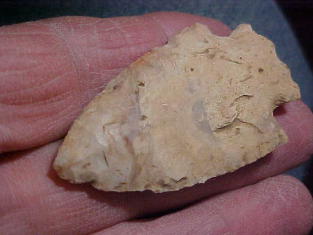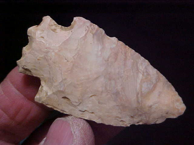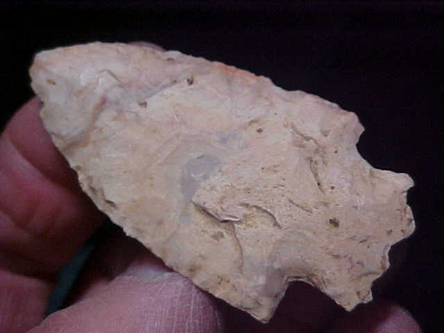 Out of Massac County in the 'toe' of Illinois, Ohio River area--three deliberate notches on the basal edge, almost a serration, but was that to keep the knife point steady in it's handle, or did the notching accomplish some other purpose. If there was basal edge grinding to start with it was cut away with the notches--you can feel grinding on the sides of the stem. The Early Archaic Hardin shows excellent pressure knapping, measures 2&5/16" by 1&1/4"--5/16" max thickness. Made of a good quality local flint, good gloss and patina. Real, period. Shipping is $8.00, checks or M.O.s welcomed, but please note I do not use paypal-type services--Roy A.