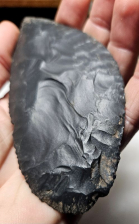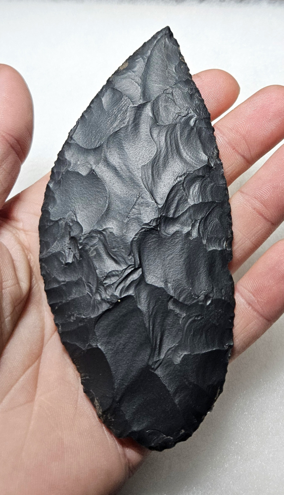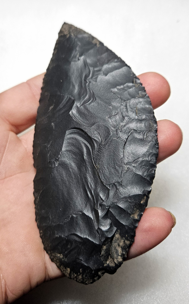 Superb skinning blade legally recovered from Walnut Canyon outside of Flagstaff AZ many yrs ago. An absolutely amazing blade with beautiful percussion removals and fine pressure edgework. Expertly made from dacite and has lots of overhang deposits. Measures 4 7/8 inches long by 2 1/16 inches wide. Don't miss this amazing blade!