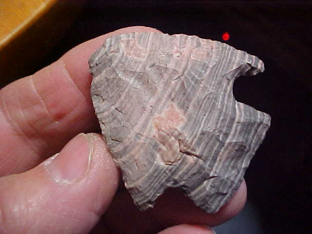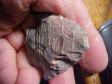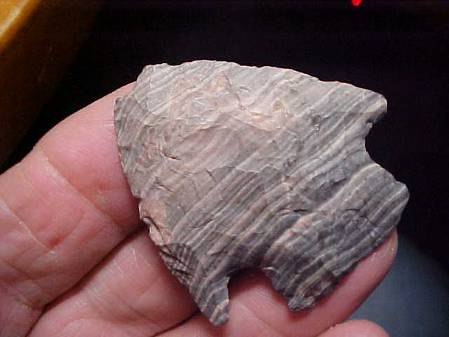 The classification I'd give the point is a Mid Archaic sliding into Woodland usage stemmed point--kind of a 'broad range', but I still haven't found a more perfectly suited classification--you may. There is no basal edge grinding, and that trait--along with the wide form is more what I assign to the Late Archiac period, forms changing so fast it's a challenge to accurately 'type' the points. Flint--hey, that's much easier--Ohio Nethers Flint/ Chert is SO distinctive, it stands out in practically any frame, your eye drawn to it. I make no apologies for the tip having been fashioned (anciently) into a buffing tool--a 10x loop will show multiple flakes removed to make the piece a polishing "scraper", worked-down from a much larger knife form--note how the tip is off-center from all that sharpen-and-use the user went through. The piece is from a north central Indiana collection but didn't come with provenance--was it found in Indiana, or was it purchased from an Ohio collector, that I wasn't able to learn--it's REAL, period. Length is 1&3/4", the width is only 1/16" less than that, thickness never reaches 3/8". Shipping is $8.00, checks or M.O.s are welcomed. Sorry, I do not use paypal-type services--Roy A.