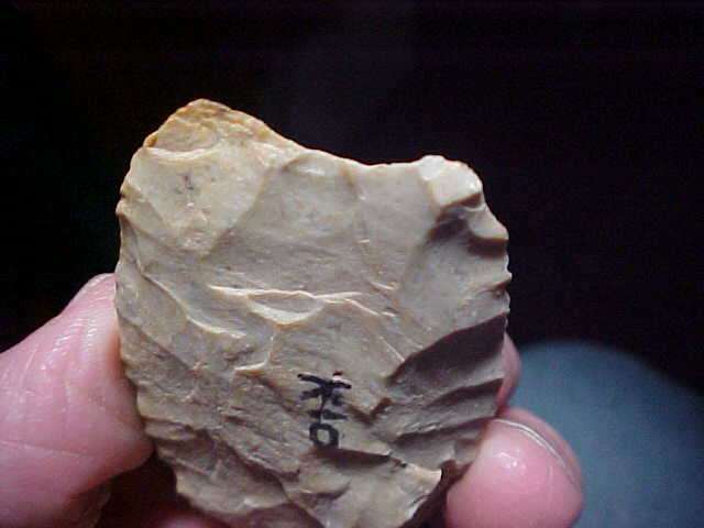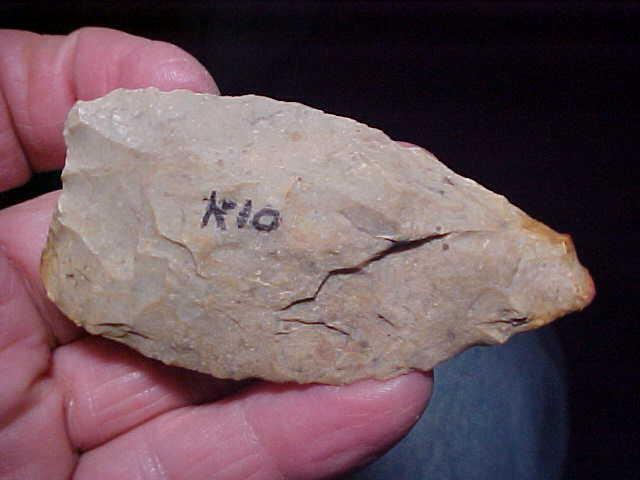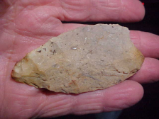 Was the auriculate base point/ blade Paleo (based on the base), or was it a preform for some other point type? I lean to Paleo based on both the fact that the base was auriculate, and that there is a shallow flute ascending from the center of the base on one face. Early Archaic bifacial blades were not shaped that way, particularly the basal edge, and later cultures--until the Hopewell, didn't make much use of bifaces (see North Blades, but their shape is much different). This Knox County, Indiana, blade is in the Holland Chert family--not showing any basal grinding I have to assume it's an 'early stage' preform. Stacks in the flint itself made knapping is difficult, so this may have remained in the 'kit' as a knife, perhaps to be finished-out as a lance tip if necessary. One fact to back that up is that the lower lateral edges ARE ground--not much more than 5/8", but edge grinding was Paleo work Length is 3&1/16" by slightly over 1&1/2"--thickness spot reaches 7/16" on a stack, but the blade is mostly 3/8" thickness. The piece is guaranteed authentic in every detail. Shipping is $8.00, and checks or M.O>s are the ways I take payments. Sorry, I do not use paypal-type services--Roy A.