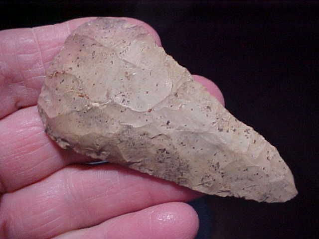 Made of a tan Jasper material (see the brown cortex on the reverse side) 3" by 1&1/2", out of a Tipton, Indiana, based collection. Black speckles of mineral deposit are all over the blade--made by an Early Archaic Culture, a rounded base Cobbs Knife; these were the same peoples who made Dovetails and Lost Lakes. The blade edges show the bevel sharpening that was their touch-up technique--in maybe its last use there was an impact fracture to the tip edge--one side only--that thin edge flake they didn't work back to a cutting edge. At a max thickness of 5/16", the Cobbs is just well made (crafted), shows every sign you could hope for of age--read that as "real, period". Shipping is $8.00, checks or M.O.s are welcomed. Sorry, I do not use paypal-type services--Roy A.