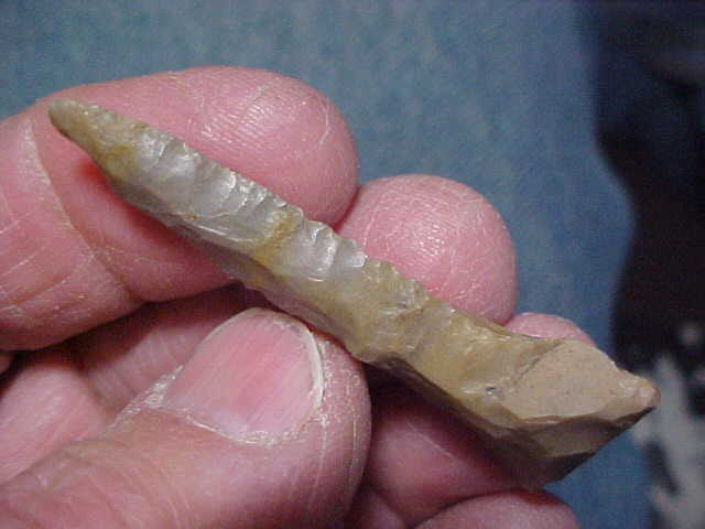 Good flint writes its own story--all I have to do is fill in a few 'blanks'--in this case length--2&1/8", 11/16" across the expanded/ flared base, and 3/8" max thickness to the Indiana Hornstone. The piece comes from a Tipton County, Indiana, area collection. The patina, the 'toning' of the hornstone is no brainer. While there is no damage the piece should show a fracture plane where freeze-thaw action lifted s flake off the shoulder. When water gets into the natural flaws (fault lines), expands, a very smooth fracture plane is left (see the close up). That keeps the price more reasonable, and also shows the authenticity--patina. The drill blade shows excellent knapping skill, the basal edge show some--not greatly ground, but a definitely ground basal edge--I'm unable to say for certain that the piece was Early Archaic Culture, but after the early Archaic basal edge grinding wasn't too common--that cultural affiliation is where I'd place the piece. Shipping is $8.00, checks or M.O.s are welcomed. Sorry, I do not use paypal-type services--Roy A.