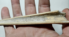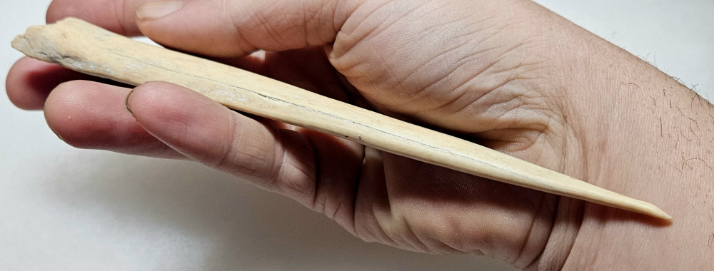Excellent awl from from an overhang outside of Flagstaff Arizona. Great size and workmanship with a nice polish and deposits. Very interesting tip configuration. Measures 6 inches long.