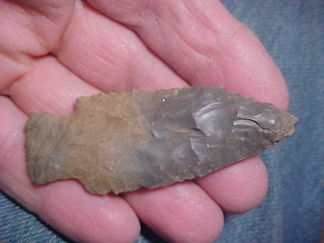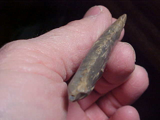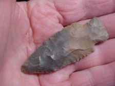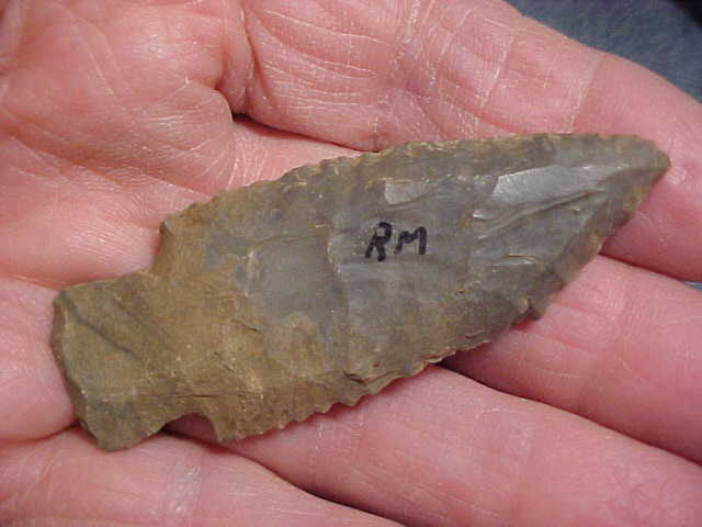 Found in a Spencer County, Indiana, area creek, made from Hornstone, and showing the four-sided-bevel sharpening technique the Harpeth River (and Searcy) peoples used for their Early-to-Mid Archaic points. Length is 2&3/4" by almost 1&1/16"--thickness is a classic 3/8" as these are almost NEVER thin point types because of the quadra-facial sharpening technique. Too, the blade edges are somewhat serrated--as they should be. The stem edges are well ground which is another Early Archaic finish-out trait. The price is reasonable due to the 'final use' where the tip impacted some hard surface, shows some wear--or maybe the ancient hunter "field sharpened" it to get a point on his knife--regardless, it shows the effort the hunter went to. The initials of the finder are inked-on, they're now part of the provenance. Shipping is $8.00, USPS rates these days, and checks or M.O>s are welcomed. Sorry, I do not use paypal-type services--Roy A.