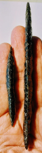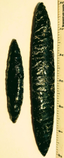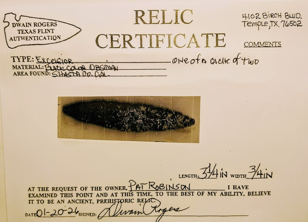 This pair of Obsidian Excelsior Blades was found together as a cache in Shasta Co., California, and they come with a Dwain Rogers COA for each blade. The largest blade is 6" in length, and the shortest is 3.25". The 6" blade appears in the COA photo to have what might be a break at approximately mid-point, but it's simply a hinge fracture. This extremely well-flaked blade is complete, as is the shorter one. It is extremely rare to find a cache of these late Archaic blades, especially containing one as long as 6".