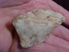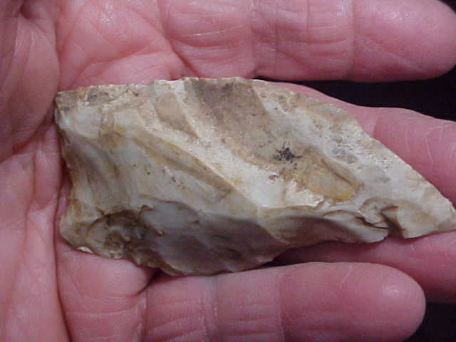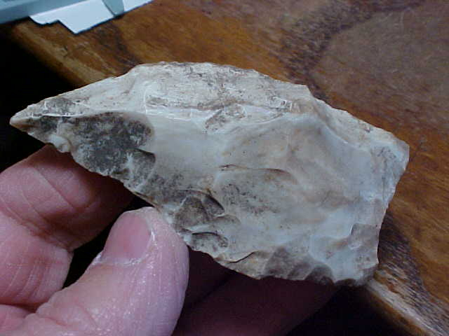 Something about the piece caught my interest--the fluted base, mostly, only a few very early cultures did that sort of basal treatment, Clovis and Dalton being tops among them. The piece comes from the Union County, Illinois, area--Burlington Chert, 3&1/8" by 1&9/16"--a ridiculous thickness of 9/16" because the knife was made off a large, thick Burlington flake. Was the piece functional, or was it a "Training Tool"? That's one for discussion--personally I think some VERY early knapper was teaching a young knapper "Here's how we make a base", he used a flint fragment and watched how the young 'student' worked it. The finished knife shows wear on the blade edges, so YES, it was a functional knife/ perforator--it worked...even if "pretty" wasn't the name of the game. The patina is great, the piece guaranteed real. Shipping is $8.00, checks, cash, or money orders welcomed. Sorry, I do not use paypal-type services--Roy A.