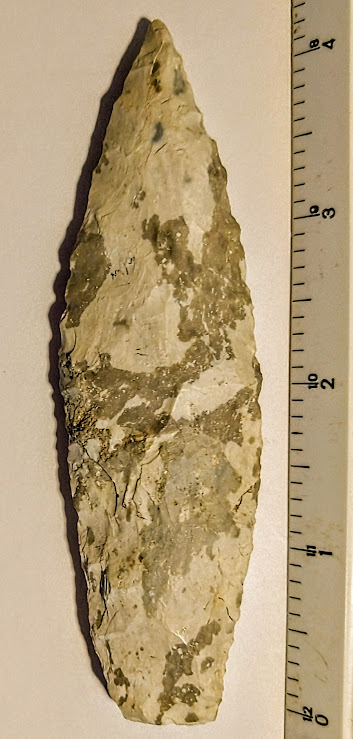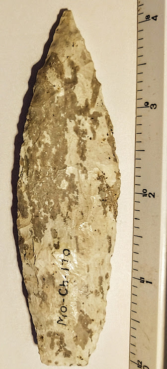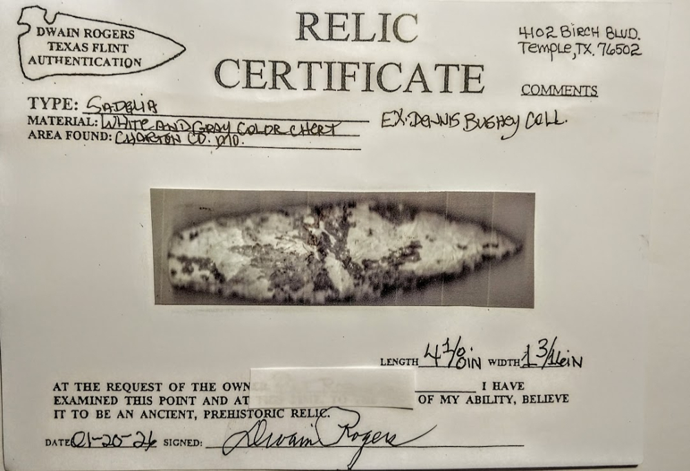 This colorful Moline chert Sedalia point was found in Charleston Co., Missouri. It was formerly in the Dennis Bushy collection and comes with a Dwain Rogers COA. It also comes with an artifact provenance sheet from a prior owner. It's a very pretty point!