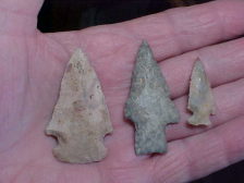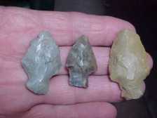 Six points left from an auction in Allen County, Indiana, decent points in their own right, better than I've found the last couple years, but that's not saying much these days. What they have in common, besides where they're from is that they represent the types of flint/ chert found near where Indiana and N.W. Ohio meet--Ft. Wayne, Indiana, area. The longest is the Buck Creek,2&1/8" of what looks to be a grade of Coshocton Flint--next is the Cornernotch Pinetree type--basal ground, 2&1/16", made of a reddish-tan chert that shows iron coloration. The smallest is the cornernotched dart that I'd call a " Gravel bar" flint--something the glaciers carried in,1&5/16". The top row are several "everyday points" showing considerable use/ wear, used as scrapers or darts (center top). ALL are guaranteed real. Shipping is $8.00 with checks (cash is fine) or M.O>s welcomed. Sorry, I do not use paypal-type services--Roy A.