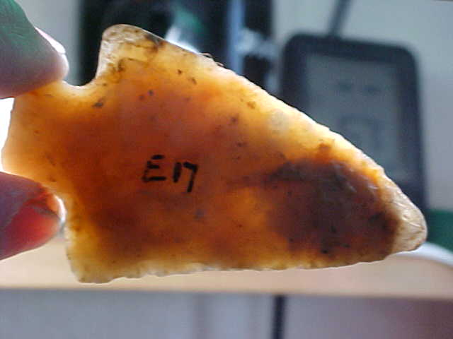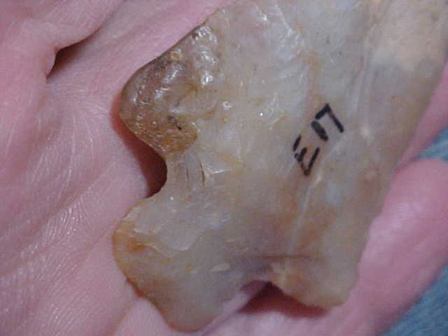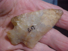 Sold at an auction with absolutely no provenance--the catalog numbers providing no help as they (E" series) was used on all different sorts of flint, Indiana pieces, blades that are either Kentucky or TN, maybe even some Ohio flints--this one I'm making an assumption, and if I'm wrong I'll readily admit it--a heat treated Flint Ridge Late Archaic stemmed point--there being no detectible stem edge/ basal grinding, the Pickwick--Ledbetter point cluster. Length is 2&3/4" by 1&5/8", 3/8" max thickness in the hafting area. The flint is very translucent--see the back-lighted photo--course that also shows the tip and barb restoration, a "waxy" material that's also translucent. In a way the material feels like a silicon--maybe IS, I can only guess at the restorer, the material they used--and how they 'colored' the restoration--decent restoration even if not museum-grade restoration, the tip and barb end too 'blunt' to do more than imitate what the missing pieces were like--bluntness could be dulled from repeated handling, too, lol. The point itself, it's guaranteed real----and as clearly described as I'm able. Shipping is $8.00, checks or M.O.s (plus cash) are the methods I welcome-in payments. Sorry, I use no paypal-type services--Roy A.