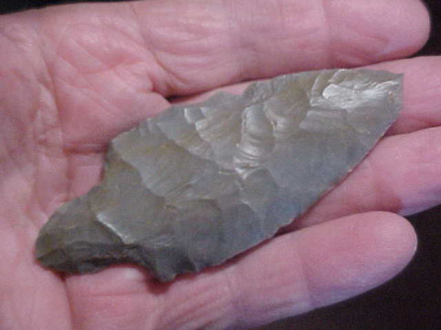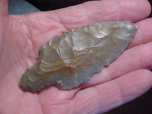 Indiana Harrison County Hornstone Late Archaic Culture Turkey Tail from the collection of a now deceased teacher in my area--length is an excellent 3&11/16" by just under 1&1/2"--center thickness is right at 3/8" max, so read that as 'balanced'--an excellent knapper some 2500--3000 years past made the big knife. The tip shows where the knife was left too close to a cookfire, a 'characteristic' pop out on the very tip--only heat does that, hornstone (with its high silicate level) does not respond well to sudden heat--the flint explodes. You see such pop outs on dart points at times, you know they were cooked IN the rabbit, flint scraps probably resulted in a number of dental problems ancient peoples suffered.. So, a Vanderburgh County, Indiana, find, well patinated, guaranteed authentic in every detail. Shipping is $8.00 with checks or M.O>s welcomed. Sorry, I do not use paypal-type services--Roy A.