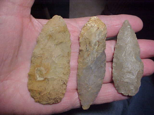 Three flint knives, the longest is 3&3/8"--next is 3&3/16", and 2&13/16"--the longest and the smaller blade are made of grades of Hornstone--middle-sized knife I can't say for certain as the last collector didn't label his artifacts--he was in N.C. Indiana, but the blades look like they're either southern Kentucky or Tennessee. I asked the auction people if they had more info they could provide, got a "How the .... would we know?" Some auctions are good about provenance, others leave you to study the piece, the patina, minerals present on the surface (iron staining on the longest piece is what you'd expect on KY and TN points, that red clay, rich in iron, so widespread in those two states). The trio are each real in every detail--THAT is clear. Shipping is $9.00--apologies for the high shipping cost but the USPS seems to be in a constant price increase cycle. I welcome checks, cash, or M.O.s, but do not use paypal-type services--Roy A.