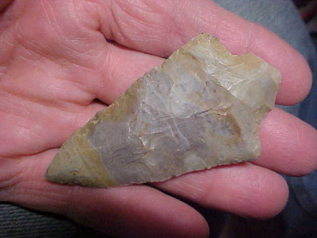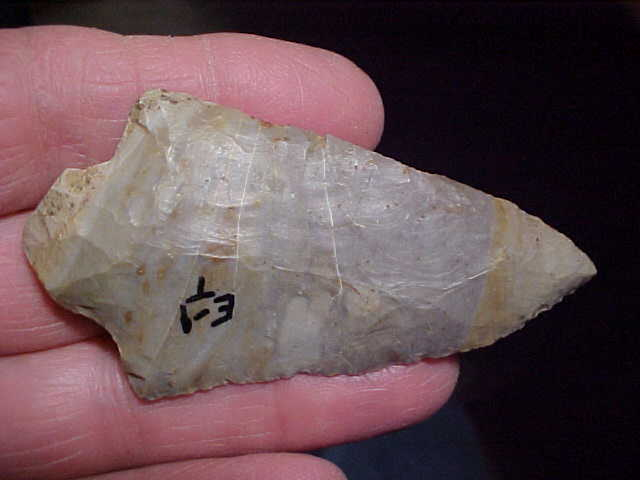 Flint that clearly states where the Mid-to-Late Archaic Pickwick was found, So. Kentucky or No. Tennessee--judging by some of the flints in the collection Edmonson County, Kentucky--the flints and the catalog numbers from the collection point to that particular area of Kentucky. Length is 3" by 1&9/16", and a 3/8" max thickness in the tie-on area of the hafted knife--that 2500--3500BP hunter did very little stem edge grinding, and he aalso used every trick to get as much blade length as possible, he hardly had enough flint on the edge of the worked flake to fashion a stem (see the flat spot on the stem, it was the outer edge of that starting flake/ preform). Good piece, good material and patina, REAL. Shipping is $8.00, checks, cash, or M.O>s are welcomed. Sorry, I do not use paypal-type services--Roy A.