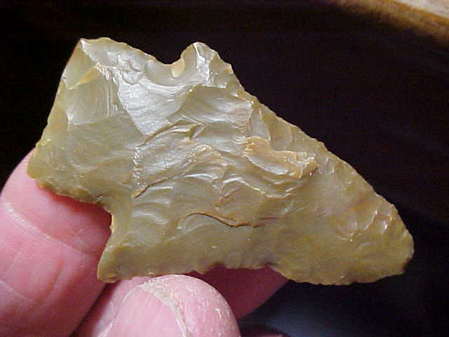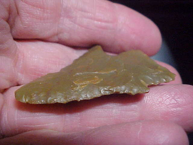 I pay the shipping on this Webster or Union County, Kentucky Kirk Stemmed--not too serrated, so I'll stick with Kirk Stemmed, a dark grey Hornstone that patinated to a green color--ONLY creek water, all the minerals will patinate hornstone that way. Length is 2&1/16" by 1&1/4"--the blade being super thin barely reaches 1/4" thickness. Probably the last time the piece was used a small chip 'dinged' the tip--and the end of one barb another end clip, but considering all the use you can see, the again-and-again sharpening of the blade, if that's ALL the damage, to me (at least) that's pretty minor. The stem shows both basal edge grinding, and a strong thinning flake that 'flutes' the base. Kirk knappers made them that way. Nice point, it's been in my personal collection some fifteen years, purchased from the finder--read that as "full provenance" you'll receive. I welcome checks, cash, or M.O.s but I do not use paypal-type services--Roy A.