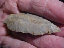 Made of hornstone, this Warrick county, Indiana, Benton Bottle Neck is 'Overstreet typical" for these Mid Archaic (6500BP) Bentons--it even has some degree of the transverse knapping scars that make Bentons and Elk River points so collectible. That (to me) was some of the highest skilled flint knapping of any culture--"ribbon flaking" is how one old collector I learned from described it. Being Mid Archaic, there is naturally no stem grinding (basal edge), but I can find some dulling on the sides of the stem--not a great deal, but it was important for the sharp edges to be dulled, not cut through the sinew that was used when hafting the knife. Length here is just under 2&3/4"--likely started as a considerably longer knife--5" Bentons--or more--are not unusual if you find one before the blade was repeatedly sharpened. Width is 1&1/8"--again, that's what you'd expect from this culture--near the tip the thickness reaches 7/16", so that's another indicator the blade was considerably longer (stage one form). The knapped fashioned a needle tip, and as it wasn't worn-down you know the blade was lost shortly after the last sharpening--i.e. no weardown. GREAT patina, guaranteed authentic in every possible detail. Shipping is $8.00, checks or M.O.s are how I welcome payments--sorry, I do not use paypal-type services--Roy A.