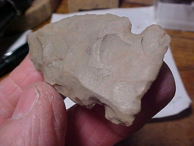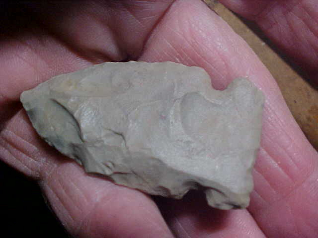 Not a great deal of basal edge grinding, so this may be more of a Mid Archaic re-invention of the Early Archaic Big Sandy points--I'll stick with Big Sandy focusing on the very straight-across base, Godars and other types from the Mid Archaic having more of an auriculate base--same for Graham Cave points from the Early Archaic. The piece was found along the Ohio River near Paducah, Kentucky--ask which side of the river that collector was working that day, well, he didn't mark the piece--flint and patina are 'right', it's real. Length is close to 2" (very slightly under) by 1&1/16"--5/16" at the thickest part of the medial ridge. One note: the base is extra, extra thin, almost fluted when you consider the flake scars on the 'front'. When I see a flute on a point this deep I have to consider if it was a 'later culture rework' of a MUCH earlier cultural point--sometimes all any of us can do is guess--as-is, it's a guaranteed authentic side notch point. Shipping is $8.00--sorry, USPS charges that for even the lightest box I can send out anymore. I welcome checks, cash, or M.O.s, but do not use paypal-type services--Roy A.