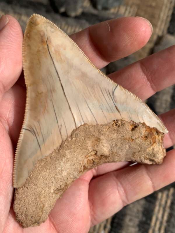 A 3 5/8” excellent Megalodon Shark t@@th, this example has beautiful color and amazing edge serrations, has one corner of the root partially restored, but other than that an amazing quality t@@th .