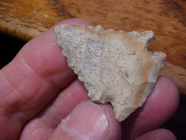 A very creek stained Spencer County, Indiana "Holland Chert" Pinetree sharpened to where it's a dart point, no longer a hafted knife--how long did it start, the width,1&3/16" is some clue--the serrations says the blade was far longer than the present total length of 1&1/2"--nearly double that length would be my best guess. The tip is intact but worn, no longer a sharp point. One barb has a small end nick, but the angled Early Archaic flaking, sort of transverse parallel work, that was the style of one very good ancient knapper. The basal edge is ground--a fact that also distinguishes the point from the Kirk Cornernotch types. Wish I knew just which creek the fellow was hunting--betting there were a bunch more Pinetree artifacts found there. Shipping is $8.00, checks or M.O.s are welcomed. Sorry, I do not use paypal-type services--Roy A.