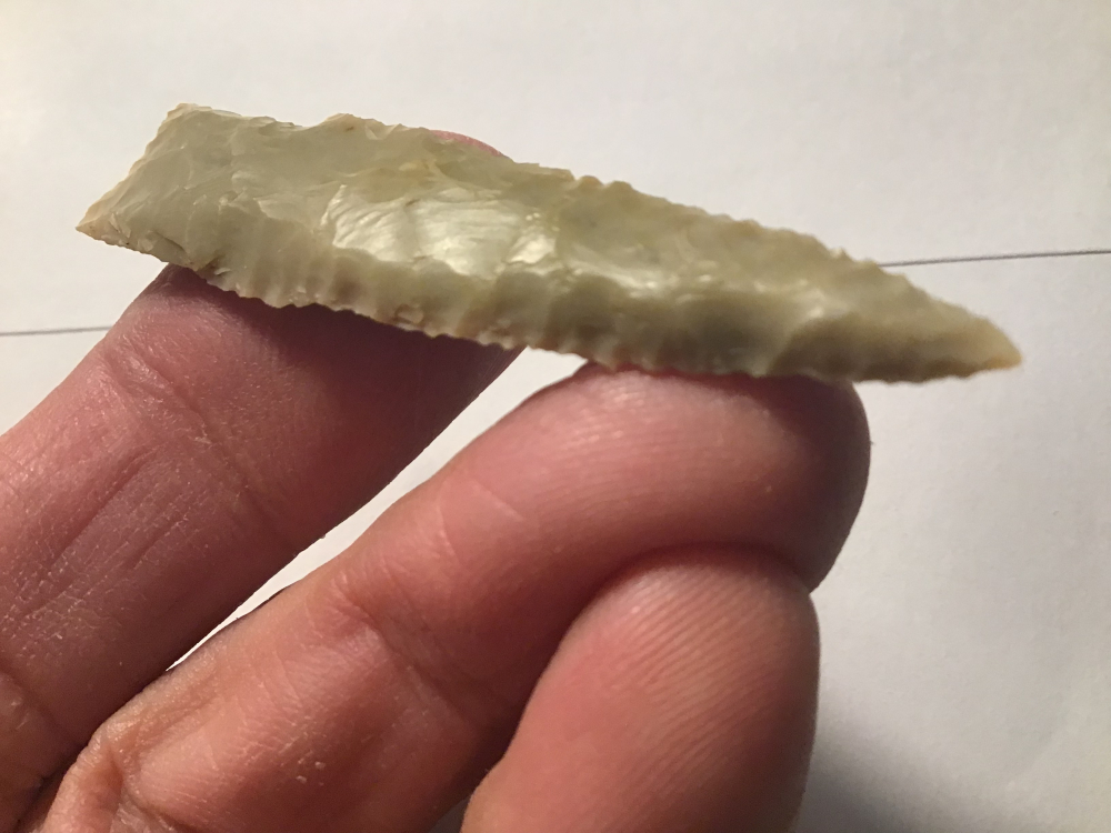 Outstanding example with serrations and riight hand bevels. Shoulders are small with long perfectly flaked stme to a fine tip. It comes with a Bill German coa from Milam county. I have the shipping.