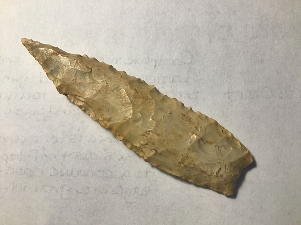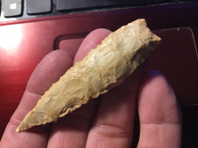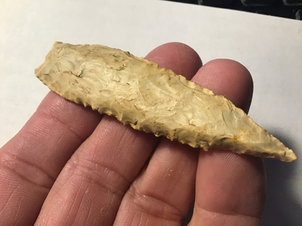 Exceptional Angostura from Lampasas County - ex Pohl Collection. It has a glossy patina made of tan Edwards with a lanceolate shape. It has a good tip with right hand bevels and serrated edges with a ground base and stem. I have the shipping.