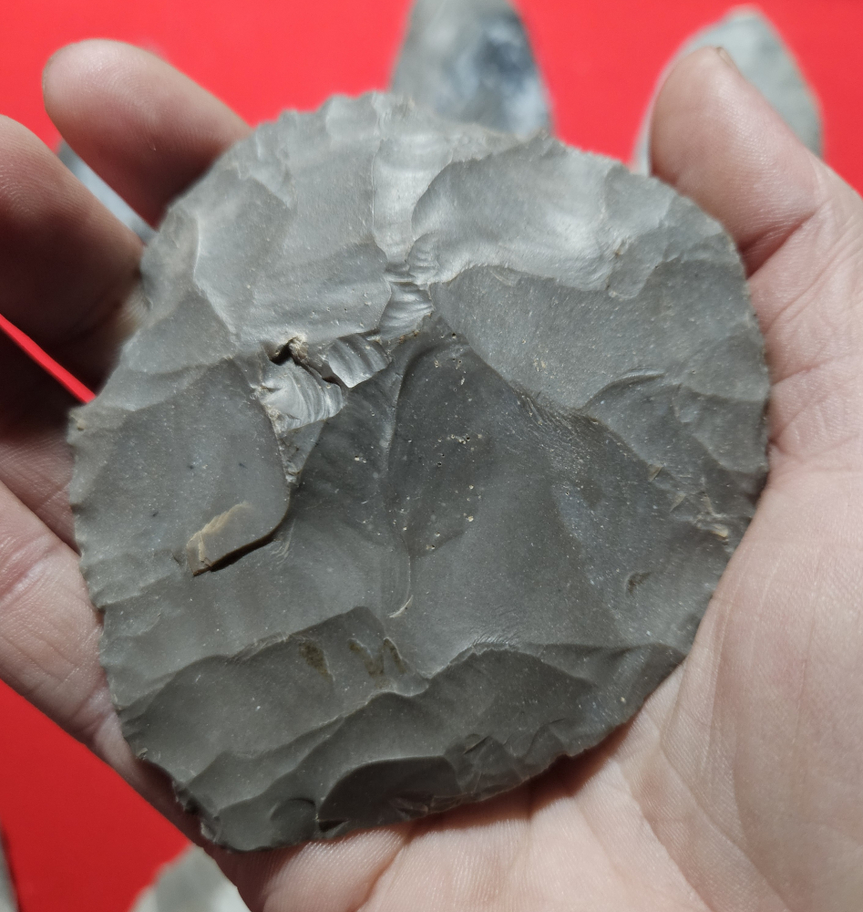 Nice cache of 14 hornstone blades from Knox Co, Indiana. These were uncovered by the plow and 5 of the 14 are broken and glued. Largest measures 4 3/4 inches long. Highly recommended cache! Very nicely percussion flaked blades with beautiful varying colors. Pictures do no justice. Shipping is on me.