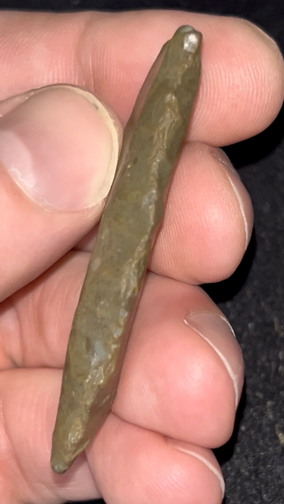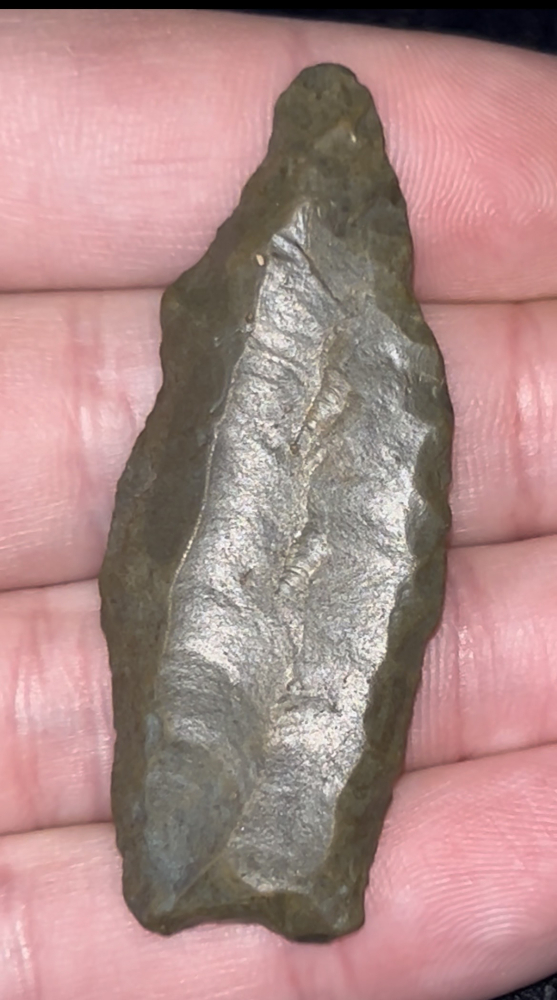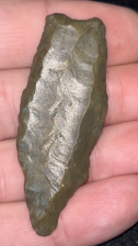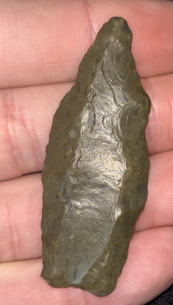 A very nice and rare Cumberland found in Kentucky. Made from medium brown material that is heavily water patinated and polished. Excellent fluting on both sides with one side being double fluted. Neat example.