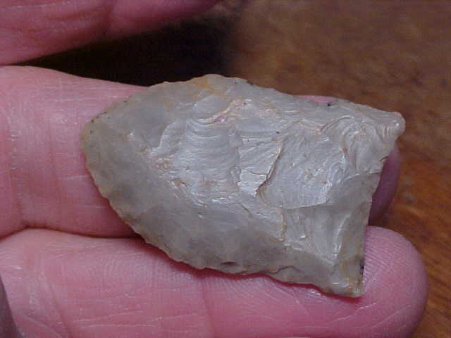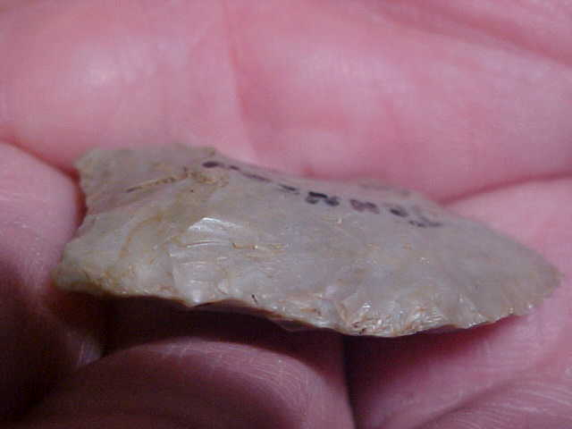 A Johnson County, Illinois, find, prov. inked-on by the last owner (or finder, I didn't ask). There is a very light flute on one face, but the 'impression' I have is that the Paleo was a salvage of a much longer Clovis--they made a new base on what was a broken tip and couldn't build a 'platform' for a flute strike which would thin the medial ridge--maybe the Paleo hunter didn't try, figuring the piece would shatter. Generally, a Clovis would be much longer than the 1&7/16" this dart measures, but like any 10,000 year old artifact we can read-in something WE think that an ancient hunter would shake their heat at--make sense? The width is 7/8", the max thickness goes slightly over 1/4"--NOT thick, but the thickness, the medial ridge extends down to the hafting area to where the final 5/16" where the base is thinned (and ground)--that "ridge" is why I think this was a salvage, not the original length. Every detail is guaranteed authentic, period. The flint looks more like Indiana hornstone than Cobden, the Illinois hornstone you'd expect in western Illinois, but there are far more grades of flint than just the 'banded' Cobden that's more common. Shipping is $8.00, checks or M.O>s are welcomed. Sorry, I do not use paypal-type services--Roy A.