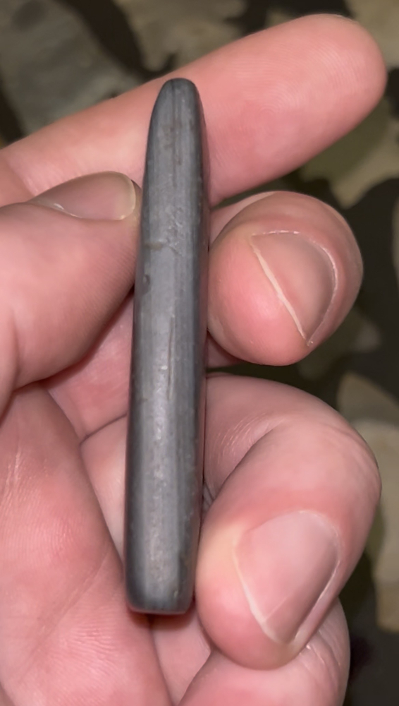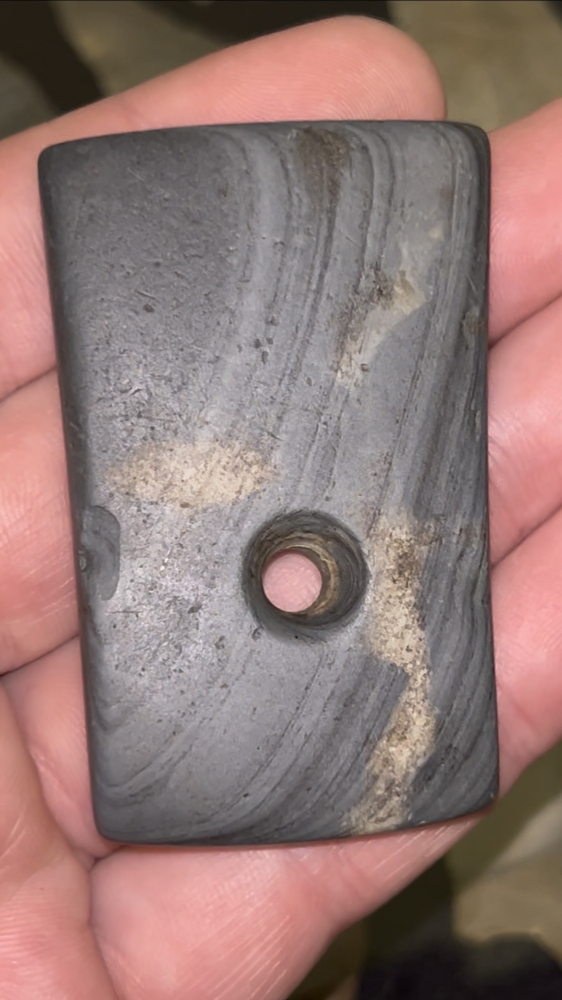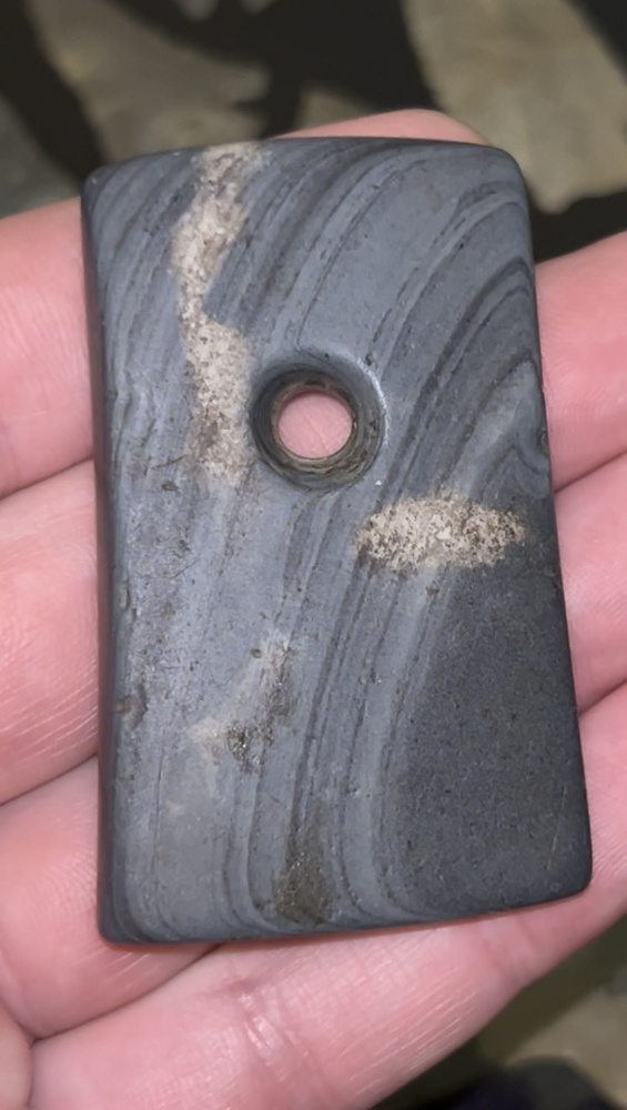 An outstanding Pendant found in Henry County, Indiana. Made from nicely polished attractive banded slate. Finely crafted with good drilling and form.