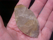 Some reason, the Adena knapper quit before fully forming a stem on this Adena--you can still see the oval shape of the cache blade they started working--the 2&7/8" piece is out of a Tipton, Indiana, area collection. REal, period. Shipping is $8.00, checks or M.O.s are welcomed--sorry, I do not use paypal-type services--Roy A.