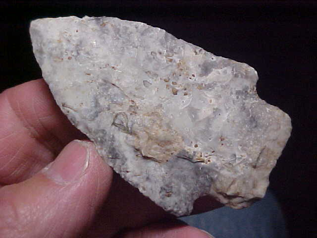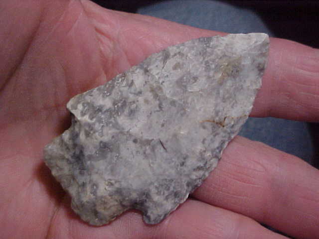 Lack of basal grinding, the stemmed point (Indiana collection) is from in the Mid-to-Late Archaic time frame. There is county information written on one face, but no amount of eye strain has yet deciphered it--the big 2&77/8" by 1&5/8" point is real, but that's as much as I can report. Shipping is $8.00, checks or M.O.s are welcomed. Sorry, I do not use paypal-type services--Roy A.