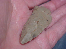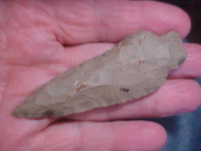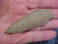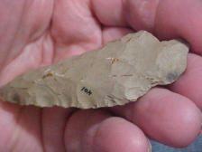Out of the Warrick county--Spencer County, Indiana, area--hornstone, 3&1/2" by 1&3/16" and "knife thickness" of slightly over 3/8"--stout hafted knife, definitely. Some previous collector catalog numbered 401 on one face, but who & when that was was 'before my time'--great patina, a little damage on a corner of the base shows more recently exposed hornstone, you can study overall patination in that farm damaged spot. $8.00 shipping, checks, cash, or M.O>s are the only ways I take payments--Roy A.