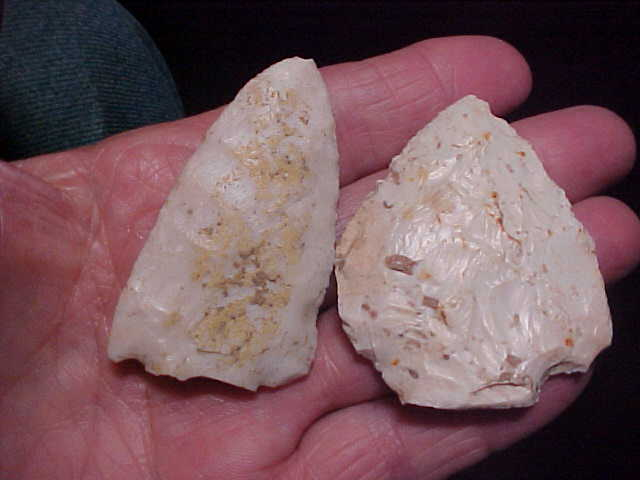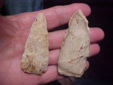 I pay the shipping (should cost about $9--$10, so you know the actual figure these six Lawrence County, Illinois, artifacts are being sold at. The group, from one collector, were very likely found on the 'not far away' Wabash River. The longest is a 3&1/16" flint knife--it shows a color band, an inclusion that rings the circumference. The other five are actual point types--a couple with snapped tips, a couple with snapped stems--they're "used", some more than others. The "higher grade" flint snap base (some old glue on one face) is Crescent Quarry, Burlington's "higher grade cousin"--it's a snap base Kirk with very high grae knapping (and a dark red iron inclusion). The wide Snyders is 2&5/16" by a wide 2"--before all the Woodland Period use that was one fine piece of flint. Any questions, please send them. I take only payments that come through the U.S> mail: checks, cash, or money orders. Sorry, you cannot use paypal-type services on my store--Roy A.