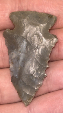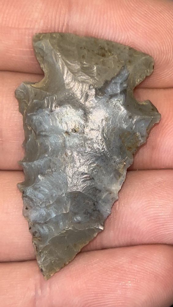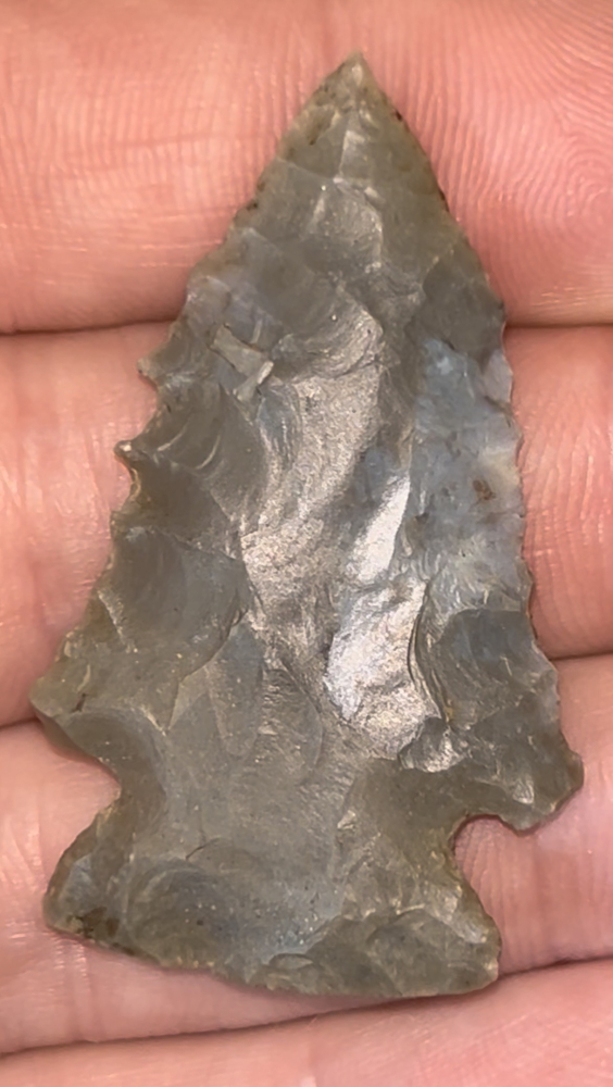 A fabulous Pinetree found by Jimmy Denny at the Swans Landing Site in Harrison County, Indiana. Made from glossy Hornstone with beautiful blue inclusions throughout. Very thin with superb workmanship and lightly serrated edges.